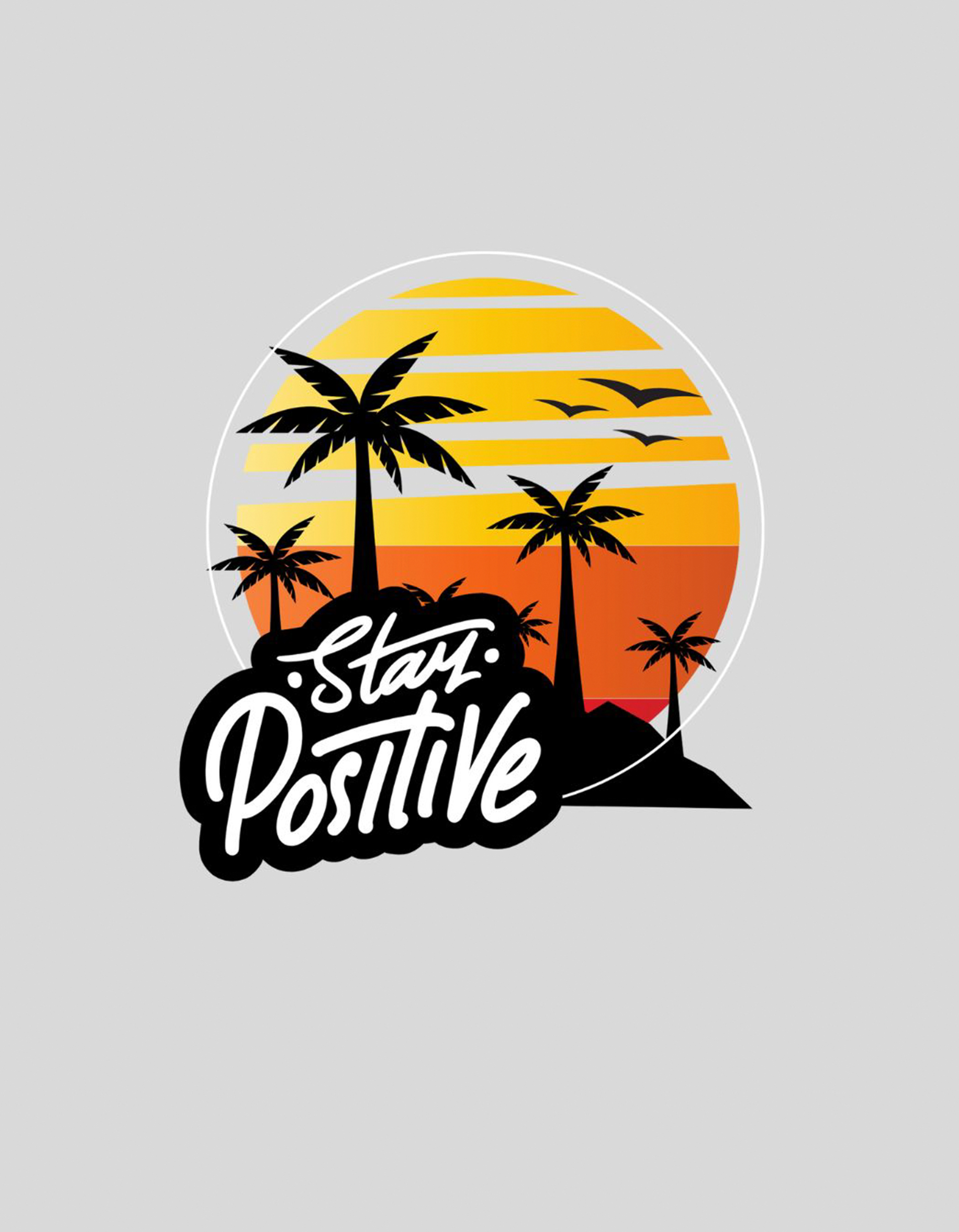 Stay stylish and motivated with this "Stay Positive" Graphic T-Shirt. Featuring a vibrant sunset beach design with palm trees, birds, and a motivational typography print, this T-shirt exudes relaxed summer vibes.