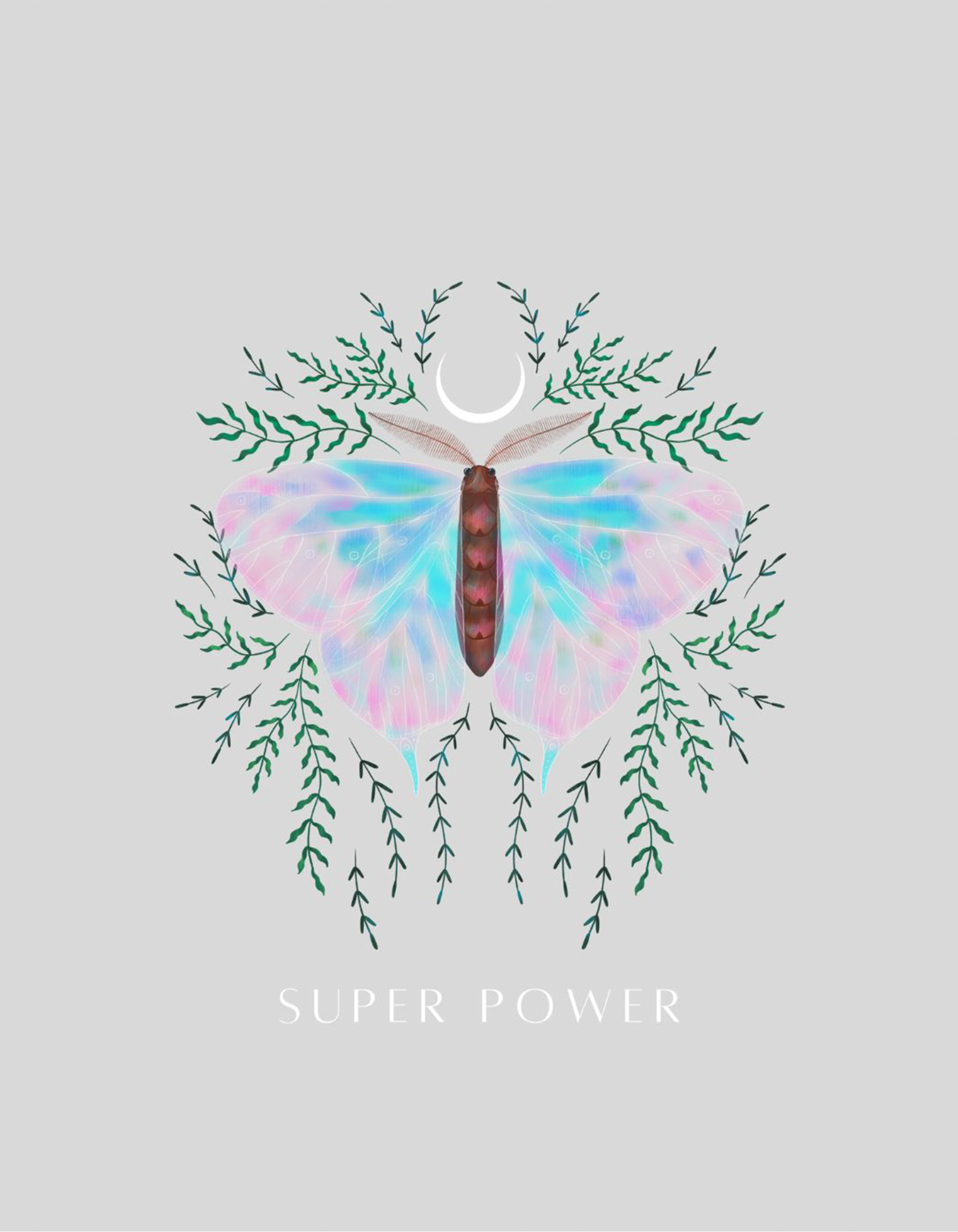Empower your style with this mystical black T-shirt featuring a vibrant butterfly, crescent moon, and botanical elements—captioned with "Super Power" for a bold statement.